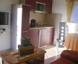 Im Wohnraum befindet eine gemütliche Sitzecke mit einem LCD-Fernseher und digitaler Sat-Anlage sowie ein CD-Radio.Daneben befindet sich eine Einbauküche.