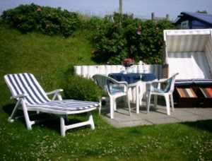 Die Terrasse liegt hinterm Haus direkt an dem Appartement und besteht aus einem Strandkorb sowie diverser Gartenmöbel